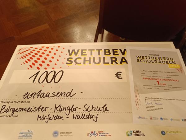 Die Bürgermeister-Klingler-Schule hat den ersten Platz im Schulradeln in der Kategorie „radelaktivste Grundschule in Hessen“ erlangt! Mit beeindruckenden 42.369 Kilometern haben unsere Schülerinnen und Schüler sowie ihre Eltern ein herausragendes Zeichen für umweltbewusstes Handeln und aktive Mobilität gesetzt. Dieser großartige Erfolg wäre ohne die engagierte Teilnahme aller nicht möglich gewesen. Ein besonderer Dank gilt unseren Kindern, die mit viel Begeisterung und Freude an den verschiedenen Aktionen teilgenommen haben. Ob beim „autofreien Schulweg“ oder bei anderen Initiativen – die Kinder haben gezeigt, wie viel Spaß es macht, mit dem Fahrrad zur Schule zu kommen und gleichzeitig etwas Gutes für die Umwelt zu tun. Ein herzliches Dankeschön auch an alle Eltern, die ihre Kinder unterstützt und motiviert haben, auf das Auto zu verzichten und stattdessen das Rad zu nutzen. Ihr Engagement hat maßgeblich dazu beigetragen, dass wir gemeinsam dieses beeindruckende Ergebnis erzielen konnten. Als Anerkennung für unsere Leistungen erhalten wir einen Preis von 1.000 Euro, der in unsere Schulräder fließen wird. Damit möchten wir die Fahrradausstattung unserer Schule weiter verbessern und noch mehr Kinder dazu ermutigen, aktiv am Schulradeln teilzunehmen. Wir sind stolz auf unsere Schulgemeinschaft und freuen uns darauf, auch in Zukunft gemeinsam aktiv zu bleiben und weitere umweltfreundliche Aktionen zu starten. Lassen Sie uns weiterhin zusammenarbeiten, um die Bürgermeister-Klingler-Schule zu einem Vorbild für nachhaltige Mobilität zu machen. Herzlichen Glückwunsch an alle Beteiligten – gemeinsam haben wir Großartiges erreicht!